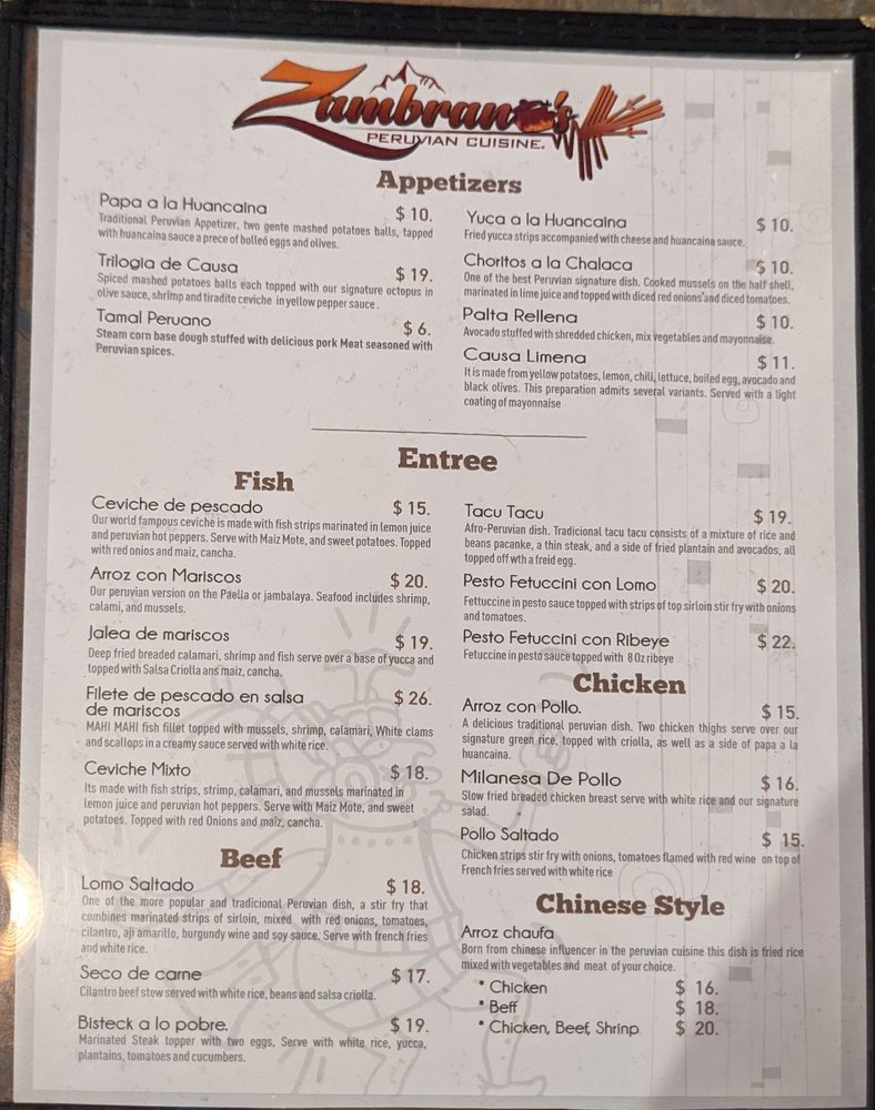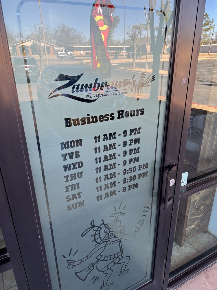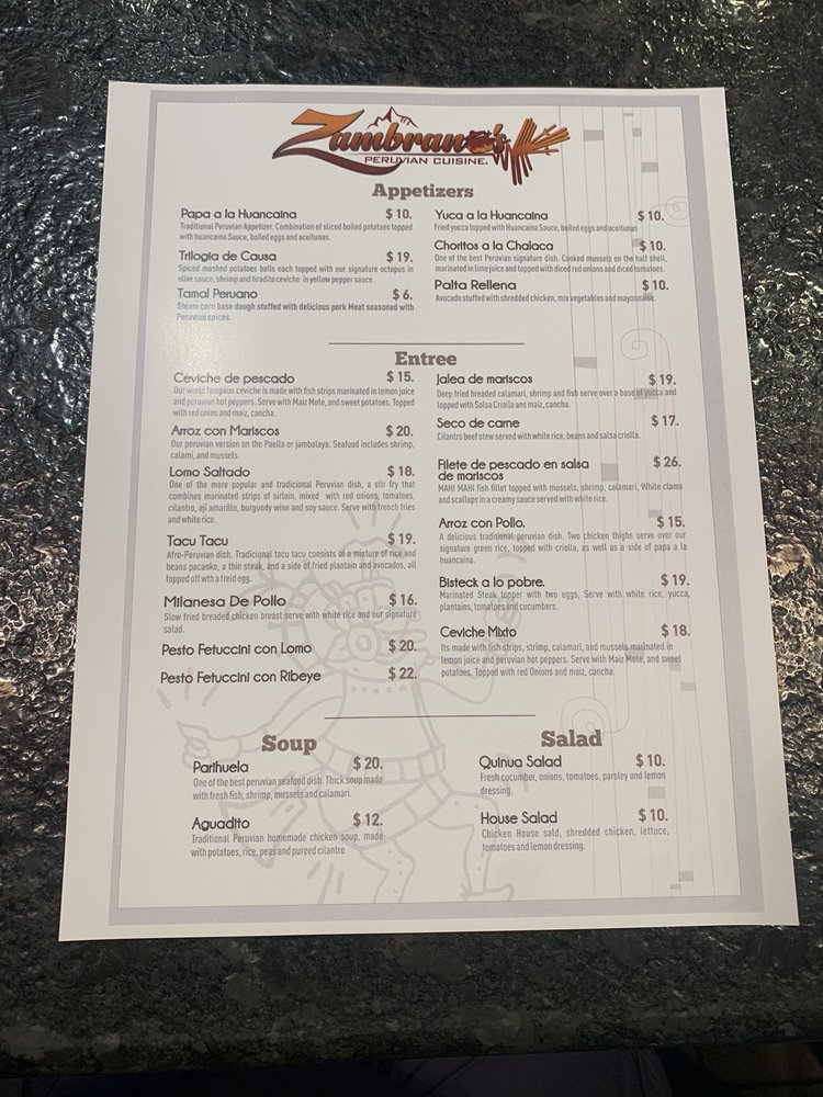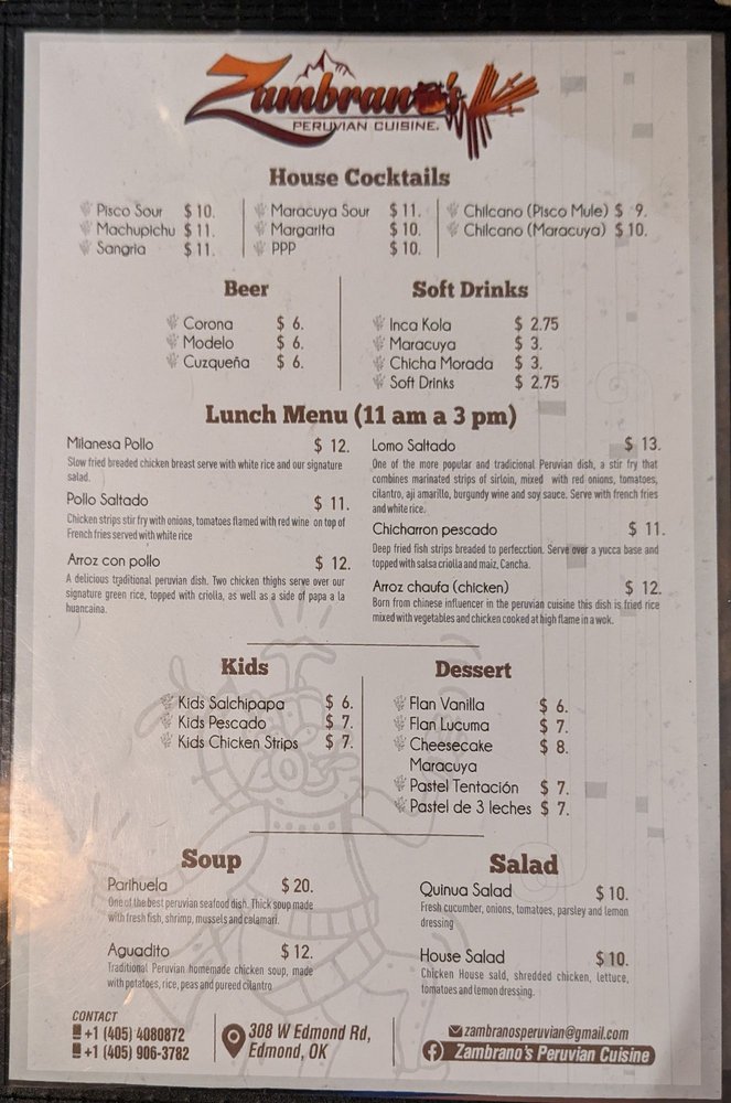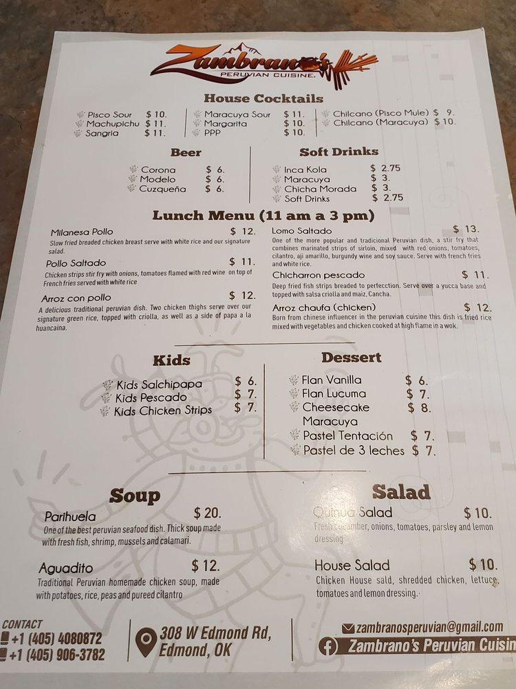 Located in Edmond, OK, Zambrano’s Peruvian Cuisine offers a wide range of Peruvian dishes with a casual, trendy, and romantic atmosphere. The menu includes traditional dishes like Arroz con Mariscos and Arroz con Pollo, showcasing the rich flavors of Peruvian cuisine. The Choritos a la Chalaca, cooked mussels marinated in lime juice, and Palta Rellena, stuffed avocado, are must-try appetizers. Pair your meal with refreshing beverages like Chicha Morada or Inca Kola. The restaurant also offers happy hour specials, a full bar, and free Wi-Fi for a comfortable dining experience. Whether you're looking for a night out with friends or a cozy dinner for two, Zambrano’s Peruvian Cuisine is a fantastic choice for authentic Peruvian flavors in a welcoming setting.